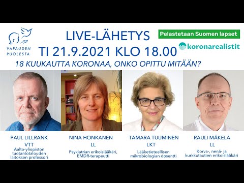 Teksti on videon alta YouTubessa: Tässä webinaarissa neljä todella kovaa ammattilaista jakaa ajatuksiaan ja käy keskustelua nykytilanteesta, menneestä 18 kuukaudesta ja tulevaisuudesta. Kysymyksiin vastataan mahdollisuuksien mukaan. Webinaari tuotetaan yhteistyössä Pelastetaan Suomen lapset ja Koronarealistit kanssa. Puhujina:
